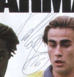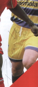 Being dead centre of the main stand also meant that we were close to the dugouts. Didn't take me long to realise that there were players in Parmalat tracksuits sitting there! I recognised Pietro Strada too!! Oh, pick up thy pen and walk, woman!!! So, I skipped down the steps to the dugout and, hey - there was baby Cannavaro! "Scusi" says I in a very fluently linguistic way! I handed Paolo my match magazines and he kindly signed amidst much use of body language. When he handed them back, I divulged my Parma allegiance by asking (sweetly) "E Pietro, per favore?" Well, nobody would know who "Pietro" was were they not a true gialloblu fan, huh?? A little nod of the head from my little friend PC and he passed along the line. (Unfortunately, Maini was in the middle - never been my favourite player - just don't see the point of him - but he had to sign too, I guess!!). Well, THANK YOU Paolo!!!! The observant amongst you will notice that there are squiggly lines on the pic of the magazine above! Click on the following to see the autographs in all their glory!!! Paolo Cannavaro Giampiero Maini Pietro Strada
