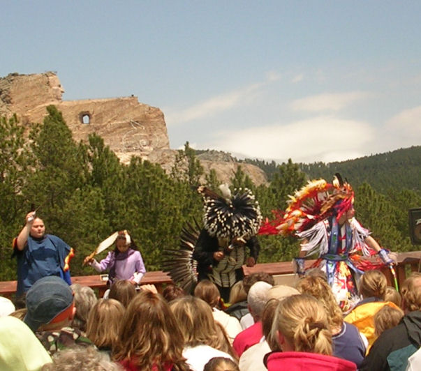 Our first stop was to the Crazy Horse Monument. Hmm. $27 they charged to enter. The monument (in the distance) was interesting, although it will NEVER be finished! There were a bunch of expensive shops (where we did buy a few things - like a pot and a couple of necklaces - and Paul bought his dad a T-shirt for Father's Day) and we were entertained by a group of Lakota (Sioux) indians. There was also free coffee and, for a small contribution, you could help yourself to one of the slabs of granite they'd chiselled off, while carving out Crazy's nose etc. But it was all a bit too touristy for me.