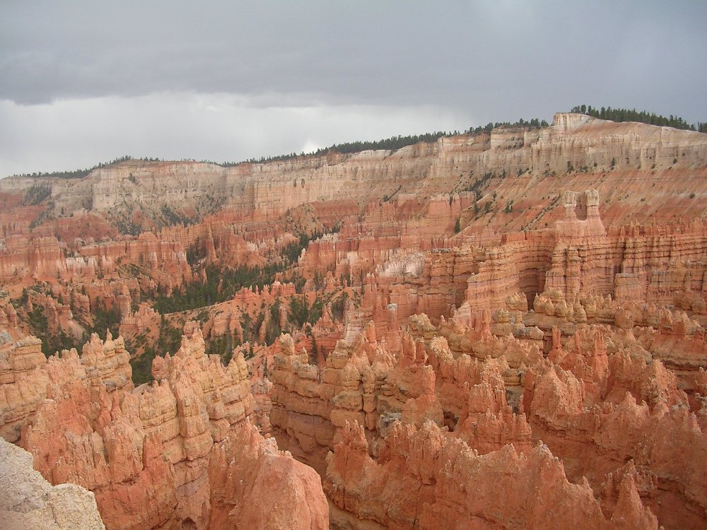 Then we were driving past Bryce Canyon cliffs themselves. It was very dark above those cliffs. We then had a look around the Visitor Center and, as we exited the park, the rain stopped!! We made a stop at Ruby's Inn and bought hotdogs (ICK!) and then looked around the shops opposite. These were mainly ROCK shops, but I was very good and didn't buy anything! The hub got petrol and announced that there was a kid in there, straight out of the film, "Deliverence"!! There were some stables here and the horses looked very unhappy that nobody appeared to want to ride them - but, no doubt once the sun came out again, they would, once more, be galloping down amongst the hoodoos - and how I wished I could join them.