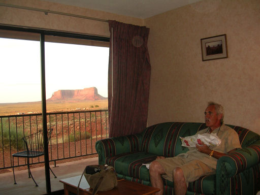 Soon, we were arriving at Gouldings Lodge. At first, they gave us a room with two queen beds, but they were happy to change this to one with a king bed plus sleeper sofa, as we had booked about a year ago! Our room (108) was on the first (ground) floor and was surprisingly quite nice, given that it was the cheapest room of our trip! The view from our balcony was overwhelmingly stunning and we enjoyed sitting outside until sunset. We had a bit of a problem with two crickets who had taken up residence in our room, but, once those were safely sent outside, we settled down for the night.