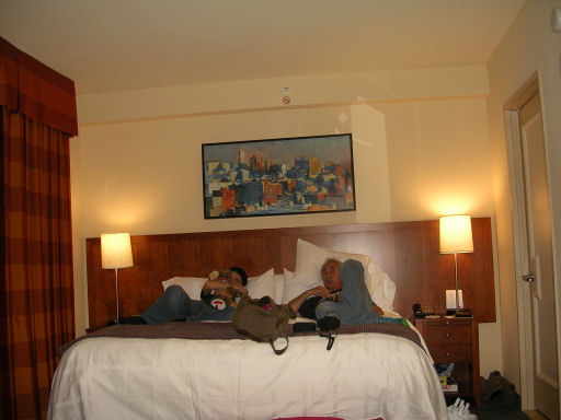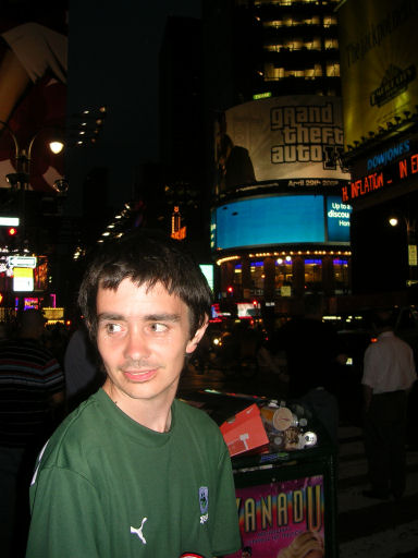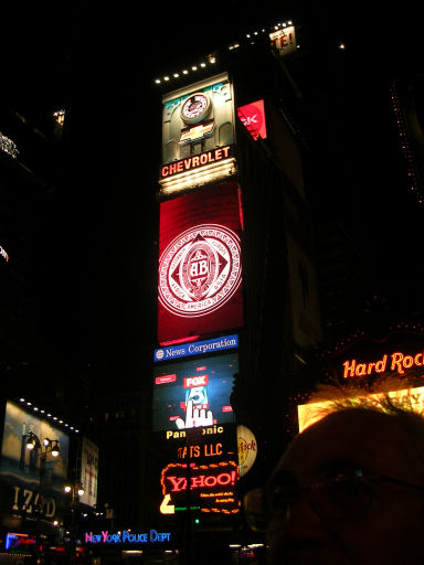 We settled in for a while, watching some 'soccer' (USA v Argentina; a friendly, I suppose) on TV and then we decided to walk up to Times Square (also, here and webcams), which was, indeed, just up the road and around the corner. And it was amazing! So many lights, so many people, so much BUZZ! We bought T-shirts in the Hard Rock Cafe and we also ventured into Planet Hollywood, where Terry had a little spar with Sly Stallone! We enjoyed the sights for a while, before we returned to our hotel for a good night's sleep!
