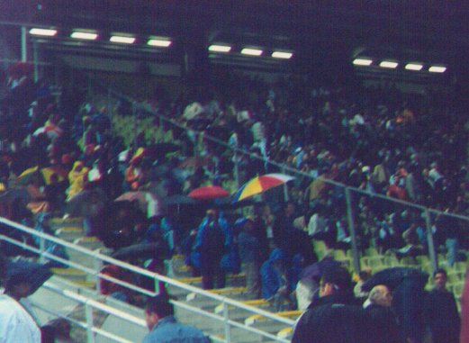 red flare). All around us were oldish men with cushions on their heads (not a fashion statement, we presumed - rather just to keep the rain off) and they occasionally muttered something unintelligible, but there was no singing or even any movement to speak of. Half-time. 0-0. Full-time. 0-0.
